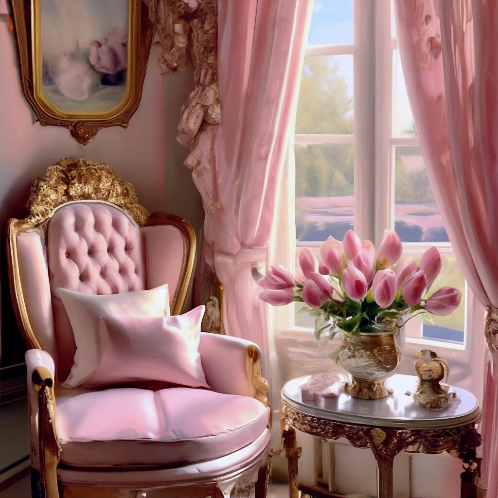 на окне стоит ваза с пионовидными тюльпанами, роскошный винтажный будуар,шёлковый занавес,органза, бархат, профессиональное оформление комнаты розовый и белый цвет в стиле ажурный шебби шик,много сложных деталей, чёткая детализация