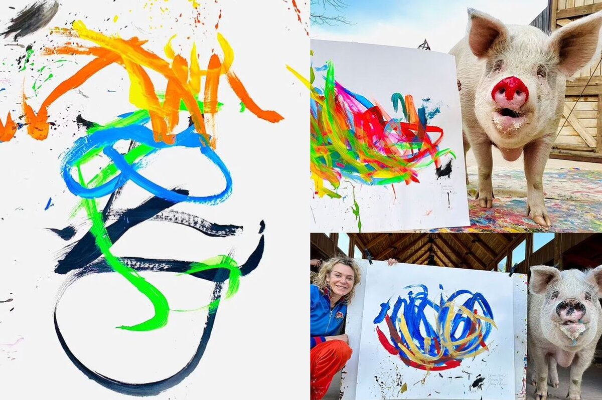 В Южной Африке умерла Пигкассо — свинья-художница, чьи картины разошлись по коллекциям знаменитостей вроде Джорджа Клуни или Рафаэля Надаля. Рассказываем удивительную историю этого животного. Мир познакомился с её творчеством благодаря активистке Джоан Лефсон. Девушка приобрела двух свинок на ферме в Западно-Капской провинции ЮАР и поселила в приюте. Рози всего за несколько минут сожрала все футбольные мячи, фрисби и другие игрушки на новом месте, а её безымянная тогда сестра покусала свои игрушки, но не тронула малярную кисть. Она зажала инструмент во рту, но не прожевала и не проглотила, а попробовала тщательно изучить. Необычное поведение свиньньи заинтересовало Лефсон — она назвала свинью Пигкассо и попробовала сделать для неё специальную кисточку: прикрепила пару пустых рулонов туалетной бумаги к деревянной рукоятке, чтобы кисть можно было держать наподобие теннисной ракетки. Кисть стала любимой игрушкой Пигкассо, после небольшой тренировки она научилась рисовать на холсте. По