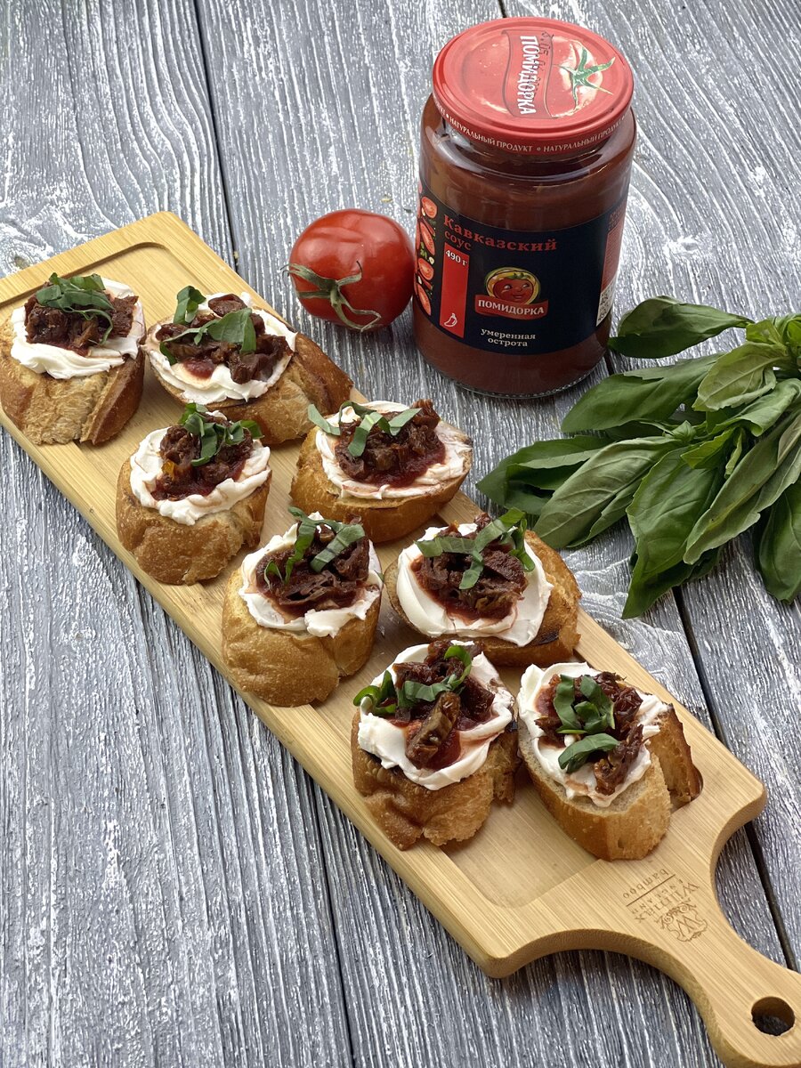- Смазываем поджаренный хлеб творожным сыром. Сверху поливаем томатным соусом и поверх распределяем нарезанные вяленые томаты. Украшаем брускетты базиликом и подаем.