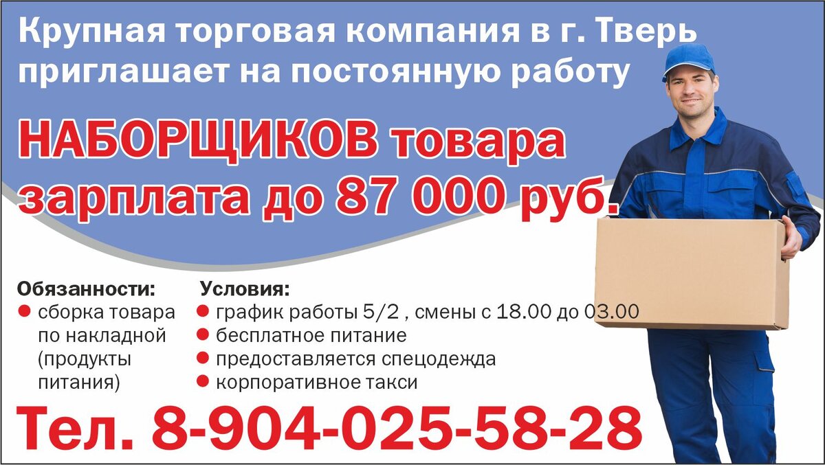 Крупная торговая компания в г. Тверь приглашает на постоянную работу НАБОРЩИКОВ товара з/пл до 87 000 руб. Обязанности: