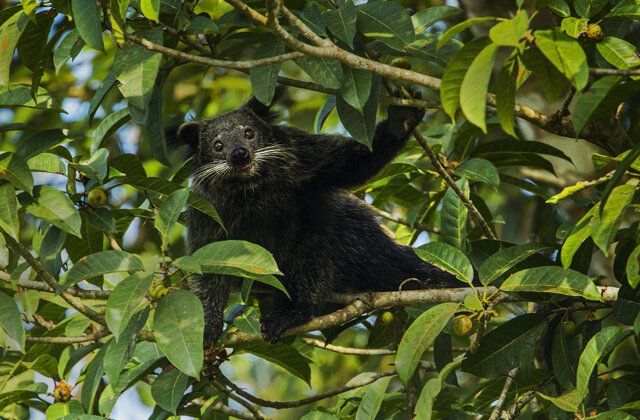 Внешне он похож на енота, но у него кошачье строение тела, обезьяний хвост и когти мангуста. По земле он передвигается как медведь, а пахнет как... жареный попкорн. Где обитает бинтуронг? Бинтуронг распространен в странах Юго-Восточной Азии: от Индии и Непала до индонезийских островов — Суматры, Калимантаны, Явы и филиппинского острова Палаван. Селится в основном в тропических лесах. Чем питается? Несмотря на то что бинтуронг является хищником, предпочитает лакомиться фруктами, семенами тропических деревьев, молодыми побегами и листьями. При желании может поймать рыбу, так как отлично плавает и ныряет. Иногда в его меню попадают мелкие птицы и яйца, грызуны, насекомые, черви, моллюски, лягушки и ракообразные. Не брезгует и падалью. Образ жизни. Бинтуронг — животное, которое большую часть времени проводит на деревьях, но также хорошо чувствует себя в воде и на земле. Правда, ходит медленно, ступая всей лапой, как медведь, отчего кажется неповоротливым, вальяжным. Зверек ведет ночной обр
