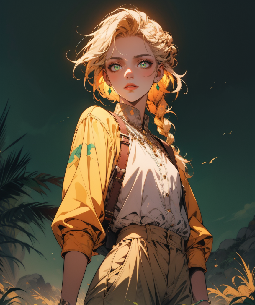 (наилучшее качество, шедевр: 1.1), SFW, 1 девушка, (маврикийское: 1.2), (прическа с зеленой французской косой), желтые брюки, украшения из шпинели, акценты кольчуги, светящиеся зрачки, темно-серые глаза, мирное выражение лица, фон саванны, плоский цвета, сел-шейдинг, жёсткие тени,
