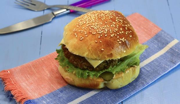 4. Разрежьте булочки вдоль пополам. Положите на нижние половинки листья салата, котлеты с сыром и кружочки огурцов.