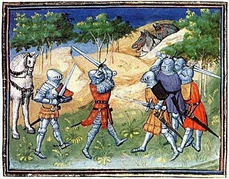 Широко распространена была такая форма судебной процедуры, как поединки. Приведу один замечательный пример судебного поединка из книги "The Medieval Underworld":