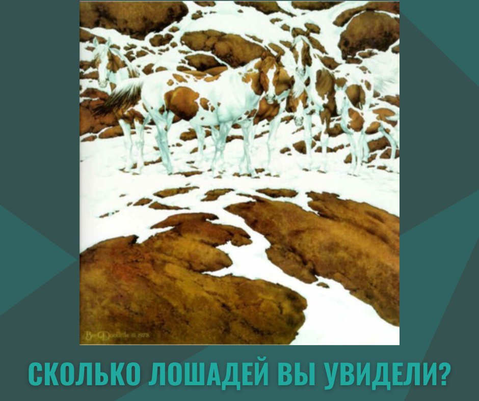 Работы американской художницы Бев Дулиттл, известной своим миметическим (подражание искусства действительности) искусством, всегда вызывали любопытство наблюдателей. Точно так же, как эта картина с изображением лошадей, замаскированных под окружающий контекст, неоднократно преподносилась средствами массовой информации как удивительная оптическая иллюзия, которая, к тому же, может рассказать об уровне вашей психологической устойчивости. Вам нужно внимательно присмотреться, сколько, по-вашему, лошадей на картинке? 👉 Если вы видели от 1 до 3 лошадей. Если вы увидели только 1, 2 или 3 лошади, у вас не очень гибкий разум, вы склонны быть довольно жестким и негибким, вы почти не меняете свое мнение, даже когда знаете, что не правы. Попробуйте задавать себе вопросы время от времени, это поможет! Развивайтесь в сторону более расслабленного человека. 👉 Если вы увидели от 4 до 5 лошадей. Вы увидели 4 или 5 лошадей? При этом у вас достаточно эластичный и гибкий ум. Вы открыты для чужих иде