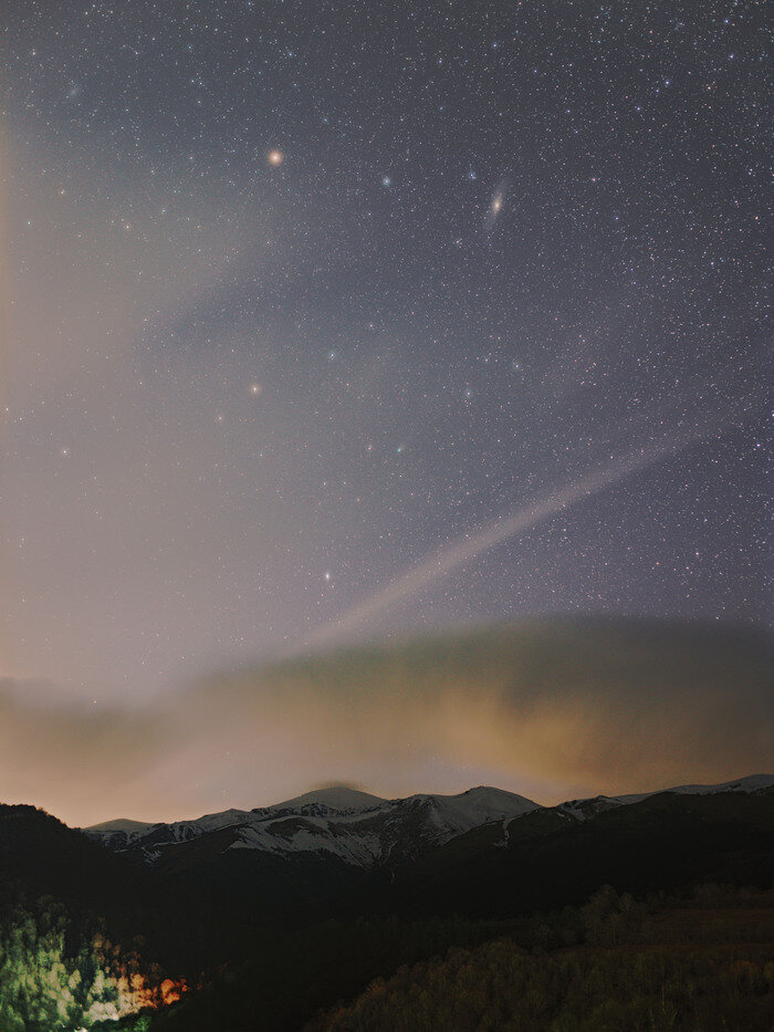Вчера у нас выпал снег и добавил белизны горам. Сегодня неожиданно был почти ясный вечер. Поэтому, было решено не менять тактику: снимать комету Понса-Брукса на 50мм объектив, чтобы в кадре были и галактики, и горы. Очень уж хотелось получить кадр с хорошо заметным кометным хвостом на фоне пейзажа. Для этого хорошо бы было сделать суммарную экспозицию около 40 минут, но "почти ясный" вечер дал нам только минут 10, и то на фоне кометы была приличная дымка, что печально отразилось на сумме снимков. Из плюсов: 1. Дымка ухудшила видимость кометного хвоста, зато "распушила" изображения ярких звёзд. Этот эффект мне очень нравится. 2. Нашли локацию с красивым северо-западным горизонтом. 3. Снег выпал не зря =) Вот тот же снимок с расшифровкой объектов: Пост автора Stelavi. Узнать, что думают пикабушники.