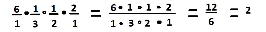 (6/1)*(1/3)*(1/2)*(2/1)=(6*1*1*2)/(1*3*2*1)=(12)/(6)=2; ---Выражение (2).