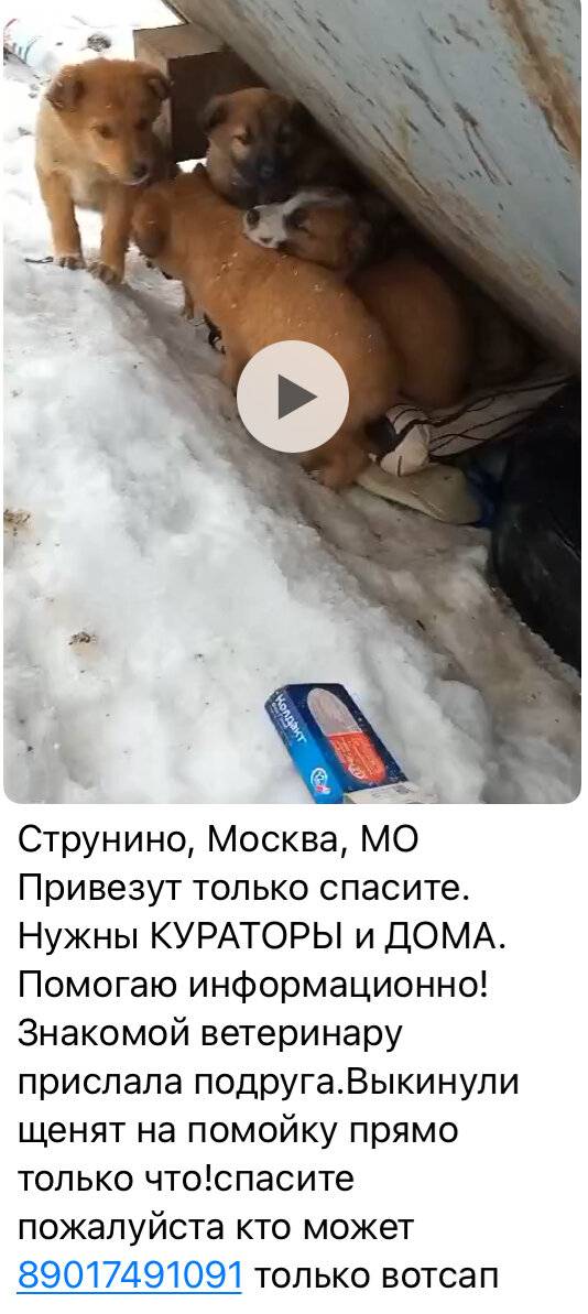 Праздник, не праздник, а щенков как выкидывали, вывозили, так и продолжают бессовестно творить этот беспредел!!! Допустили рождение, подрастили, а потом взяли и «гуманно» вывезли НА ПОМОЙКУ!!! 😠 Простерилизуйте свою собаку и не берите грех на душу! Это живые существа!!! А вдруг не найдутся сумасшедшие типо нас, кто будет трезвонить во все колокола и искать пути спасения! А вдруг погибнут, замерзнут и умрут?! Как можно спать спокойно, сотворив такое! Они же живые!!!! Слов нет…, одни буквы! 😩 МОСКВА, Струнино!!! Мы не смогли пройти мимо! Пока информации немного! На помойку вывезли щенков, прямо сейчас на холоде в снегу мерзнут вот такие малыши!!! Смотрите сами! Вы знаете, что у нас у самих не по одному хвостику, а на постоянной передержке переболевшие щенки и собаки и этих малявок туда нельзя!!!! Пожалуйста, давайте вместе найдем выход!!!🙏🙏🙏 В честь праздника, в честь 8 Марта, давайте сотворим чудо для этих малышей!!! Мы не можем оставить их там замерзать!!! Пожалуйста, хоть по ще