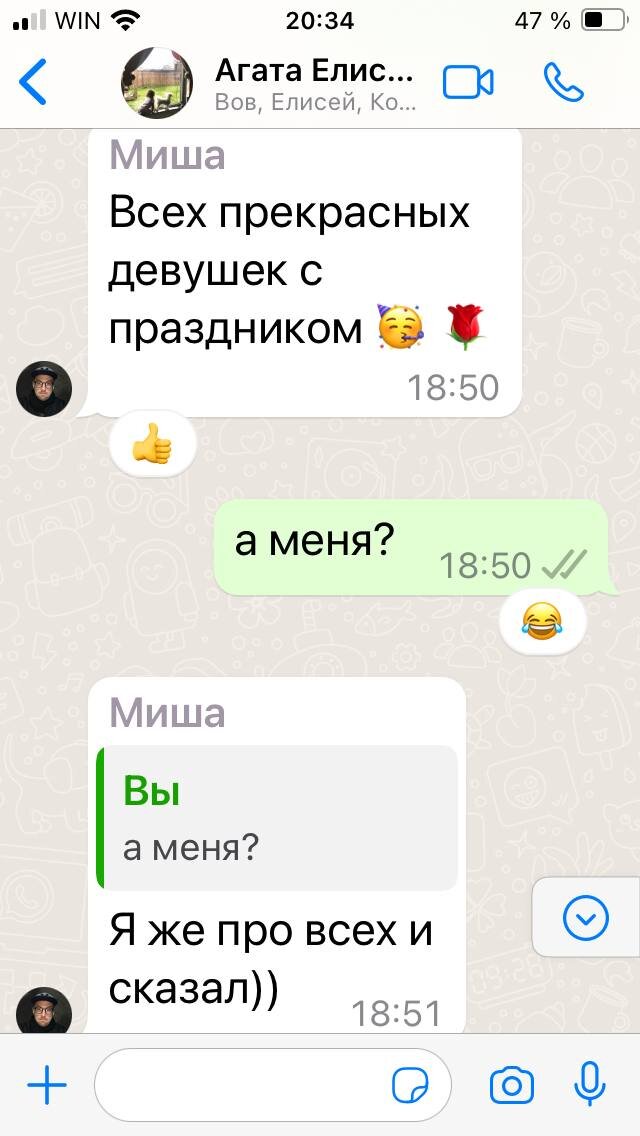 В семейном чате дочкин муж пишет по случаю праздника, а я пользуясь случаем шучу: