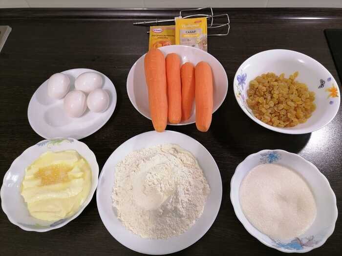 Давно заприметила этот рецепт, но долго не решалась приготовить. Думала, как так? Пол килограмма тёртой моркови в тесто? Что же это получится? А получается очень вкусно. Проверено неоднократно. Понадобится: Яйца С0 - 4 шт. Сахар 200 гр. Сливочное масло 200 гр. Мука 300 гр. Морковь 500 - 600 гр. Изюм 150 гр. Можно заменить орехами. Например, грецкими. Соль 5 гр. Ванилин или ванильный сахар 9 гр. (1 пакетик). Разрыхлитель 10 гр. (1 пакетик). Выпекать при 180 градусов 45 - 60 минут (зависит от вашей духовки). Масло доводим до размягчённого состояния любым привычным для вас способом. Я оставляю при комнатной температуре до мягкости, потом ставлю на 30 секунд в микроволновку. Изюм моем и обсушиваем. Если используете орехи, их лучше измельчить до средней фракции. Ну, или как вам нравится. По поводу моркови: Я обычно беру около 600 грамм не чищенной. После помывки и чистки от неё остаётся примерно 500 - 550 грамм. Как раз то, что нужно. Дальше всё просто. Яйца взбиваем с сахаром до полного ра