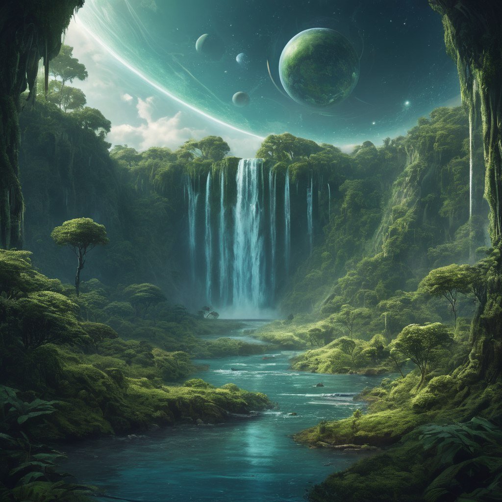 И жемчужина нашего космического тура – последняя планета, на две трети покрытая водой, очень похожая на мою родную Землю. Небольшие кусочки почвы омывают океаны и моря, режут разветвленные реки, сонно поблескивают тихие озера и обрушаются мощные водопады. Эта планета обитаема благодаря специфической форме жизни, которая приспособилась к недостатку кислорода и водной среде. По прибытии нам выдали кислородные маски, в остальном люди вполне безопасно могли находиться здесь. Сойдя на поверхность, мы двинулись вдоль живописного берега небольшой реки. В ее водных просторах среди кристально чистой воды плавно колыхались водоросли-гиганты, которые тянулись широкими листами к свету. А в глубинах реки резвились стайки маетливых рыбешек, которые совершенно не боялись нас. И порой, поднимаясь на поверхность, выпрыгивали из воды, блистая чешуйками на солнце. На берегу раскинулись густые леса с яркими цветами и гигантскими лианами, словно ниточками, связывая воду и землю. Шелест листвы сливался