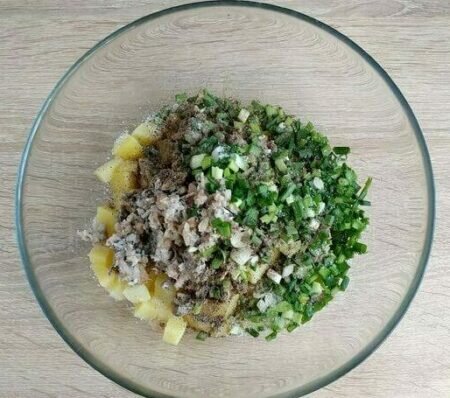 - Добавляю соль, перец и хорошо все перемешиваю. Если вдруг начинка суховата, то добавляю масло с консервы 2-3 чайной ложечки.