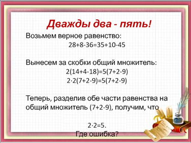 В каких случаях дважды два равно пяти? Как с помощью математики логику можно довести до абсурда. «Дважды два — пять» (2 × 2 = 5) или «два плюс два — пять» (2 + 2 = 5) — арифметически некорректные фразы, использующиеся как краткое и яркое представление алогичного утверждения. А если так: 0=0, 15-15=0, 10-10=0, то 15-15=10-10, 3(5-5)=2(5-5), 3(0)=2(0), при сокращении нулей, на ноль делить нельзя. Выносить за скобки общий множитель при делении неправильно. Выносит общий множитель можно при сложении или вычитании. Невольно задаёшься вопросом: «неужели нет способа найти решения, где 4=5? Однако, при определённых условиях можно записать уравнение следующим способом: 4 в 0 степени=5 в 0 степени, далее: 50х1, получаем: 4 в 0 степени=5 в 0 степени х1, ничего не меняется. 5 в 0 степени переносим в левую сторону от знака равенства и получаем: 4 в 0степени/5 в 0 степени=1, далее записываем уравнение (4/5) в 0 степени=1, пока всё верно. Если подходить к вопросу в лоб, т.е. корень 0-ой степени равен