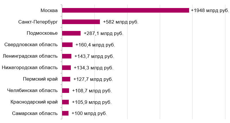 В список также вошли Свердловская (рост на 27,2%, всего 751,1 млрд руб., бюджет получил 57,3% от суммы) и Ленинградская области (на 34,8%, 556,6 млрд руб., 47,8%), Пермский край (на 16%, 928,3 млрд руб., 27,5%), Челябинская область (на 27,5%, 504,9 млрд руб., 51,9%), Краснодарский край (на 20,1%, 632,4 млрд руб., 70,6%), и Самарская область (на 11%, 1 трлн руб., 30,5%).