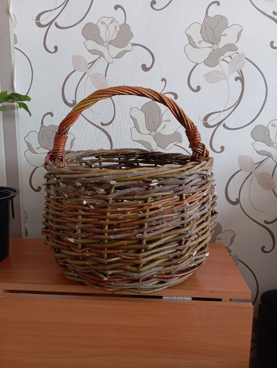 Дело было вечером, делать было нечего... Когда рука мужа потянулась за очередной сигареткой, ему было предложено заняться чем то, чтобы мысли его были заняты другим... И вот было предложено заняться плетением из ивы ( не боги горшки обжигают) . 🤔А на улице зима матушка , январь, сугробов намело будь здоров! Поехали. На радость нам и на удивление, в поле была прочищенная дорога, так как на тот момент, были не убраны подсолнухи. Заросли ивы у нас растут повсюду. Через деревню протекает речка, весной ,разливаясь она заполняет ляги, болота, болотца. Из снега выглядывала половина куста 😳 , ну мы настырные и что мы сюда зря сюда припёрлись... Мелкими и осторожными шажками пошли к намеченной цели. Верхушки были коротковаты, а длинные толстоваты и с большим количеством боковых побегов.Что было то и привезли . И только потом, зашли на просторы интернета , чтобы узнать что да как. Слепили из того что было было. 😂Итог: корзина получилась большая, для нас красавица из красавиц! Первая, как мы