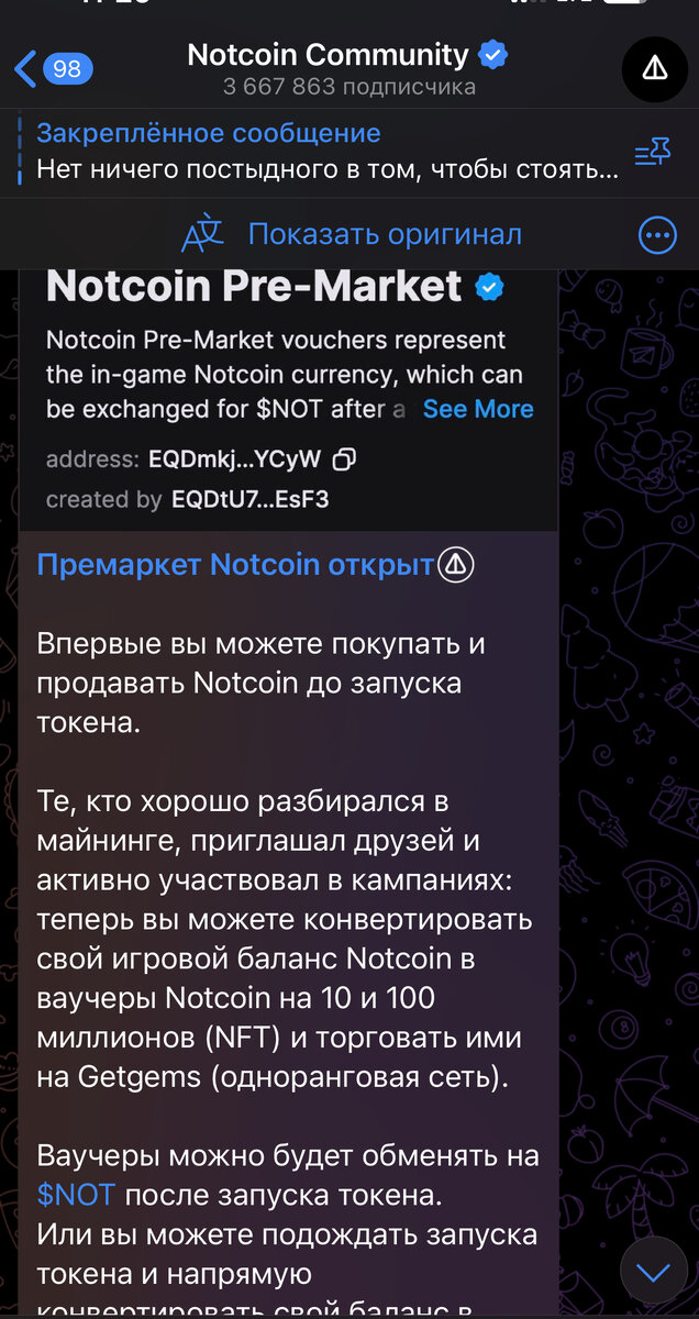 Пре-маркет Notcoin официально запущен. Но есть нюансы, как говорится. О них то мы и поговорим в этой статье. Приветствую всех! В официальном канале Notcoin вы могли увидеть вот такое сообщение(демонстрирую сразу на русском): Что это значит? Объясняю. Листинга у монеты по-прежнему нет. Но разработчики дают нам возможность попробовать поменять свои NOT на реальные деньги. Не напрямую конечно же, а через ваучеры. Как это работает? Что для этого нужно? Важно - и кошелёк и getgems и NotcoinBot должны быть на одном аккаунте! А теперь разберём - стоит ли это сейчас делать?! Лично я не тороплюсь с этим вопросом, ведь очевидно сейчас будет очень много желающих продать Notcoin и получить свои халявные две копейки. Огромный навес продавцов при отсутствии понимания у покупателя «а сколько же оно должно стоить» неминуемо приведёт к недооценке актива. Вот что мы сейчас видим в getgems: Лучшее предложение на продажу - 5 TON за 1 миллион Notcoin. Много это или мало? Считаем. 1 TON =