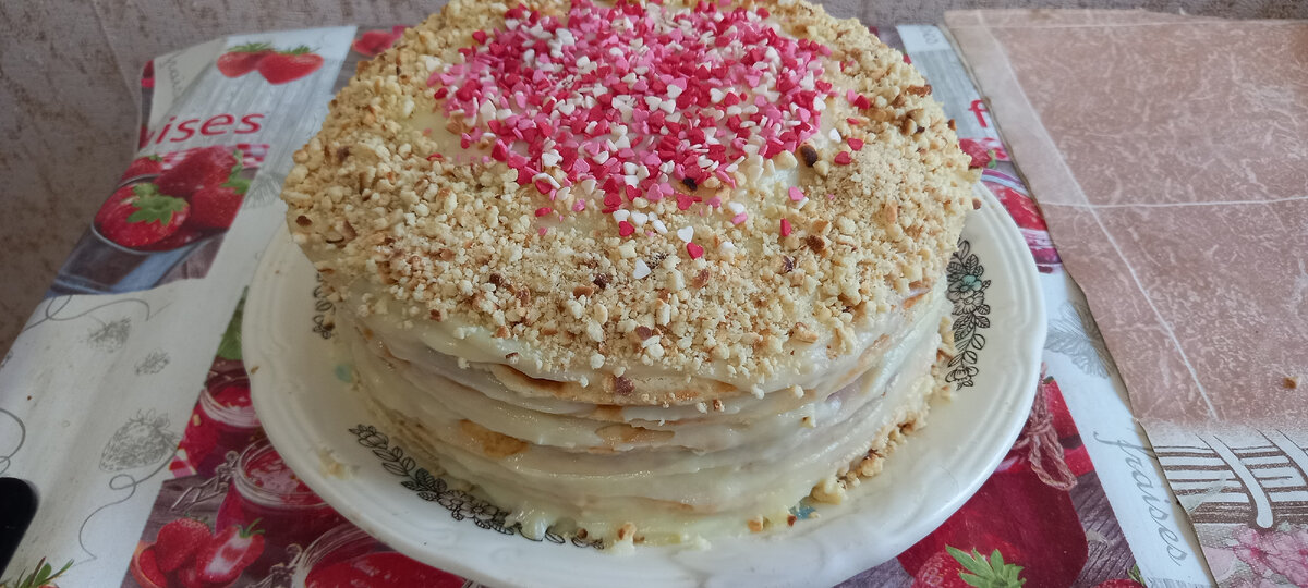 Друзья, предлагаю рецепт торта с заварным кремом. Готовится быстро, так как коржи жарятся на сковороде. Минимум усилий и у вас на столе изумительный десерт к чаю Для теста потребуется: 1 яйцо 3 стакана муки 1 банка сгущеного молока 1 чайная ложка соды 1 чайная ложка уксуса Для крема потребуется: 200 г сливочного масла 750 мл молока 2 яйца 1,5 стакана сахарного песка 3 столовые ложки муки 1 пакетик ванильного сахара Замешиваем тесто. Для этого берём все ингредиенты и перемешиваем до эластичного теста. Затем раскатываем в форме колбаски и разрезаем на 8 частей. Далее раскатываем каждую часть до размера сковороды, на которой будем жарить. Каждый корж обжариваем на сковороде по 1 минуте с каждой стороны. Получившиеся коржи обрезать до ровных кругов. Остатки растолочь в крошку и оставить для обсыпки. Теперь готовим крем. Смешать все ингредиенты для крема, кроме сливочного масла. Поставить на средний огонь и постоянно помешивать. Варить до загустения. Затем снять с огня и добавить сли