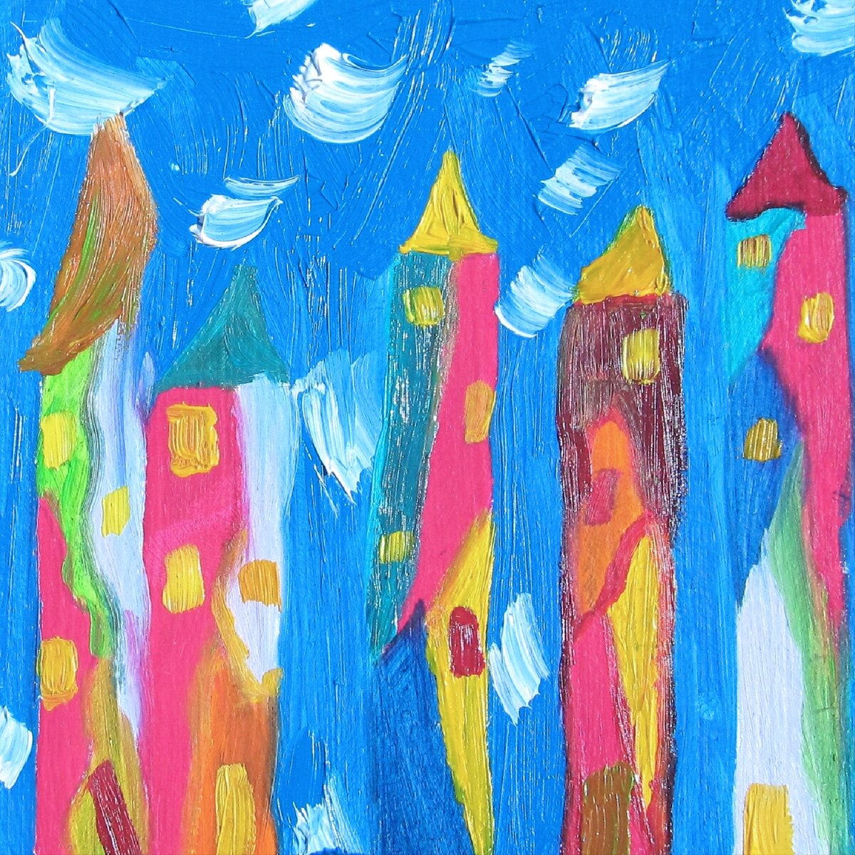 Дома все выше и выше устремлялись своими остроконечными вершинами к небесам. Они хотели почувствовать своими крышами дыхание ветра, лучи обжигающего солнца, мягкость нежных облаков. Головокружительная радость охватила их, они влюбились в небо. И по сей день стоят высокие дома под небесами, влюбленно глядя на них. Масло, картон. Размер 10х10 см.