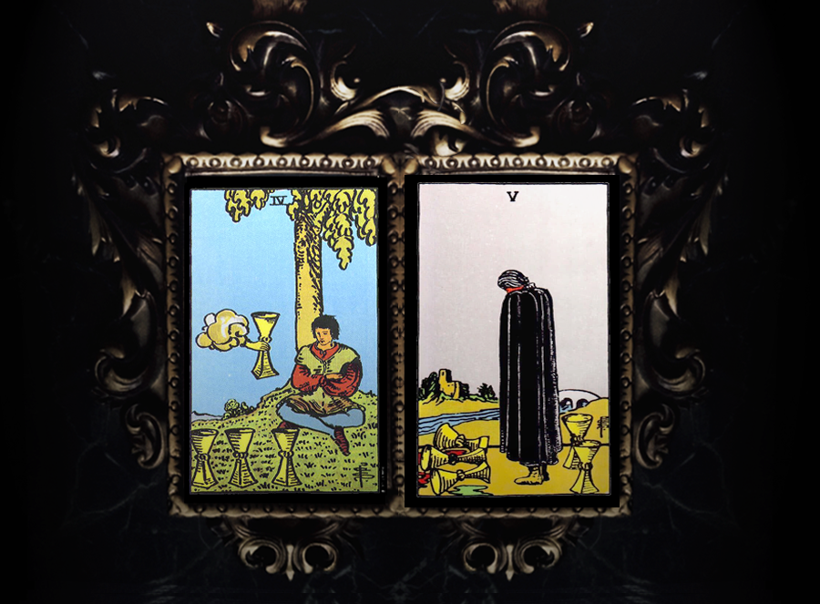 Персонаж Четверки не глядя отказывается от протянутого ему кубка. Точно так же человек, описываемый этим арканом, склонен опрометчиво обесценивать возможности, даруемые судьбой. Он не смотрит ни на сам кубок, ни на его содержание, и заранее предвзят — отворачивается и опускает голову в нежелании рассмотреть предложенный вариант. Ему, по всей видимости, хочется чего-то особенного. Зачем ему еще один кубок, если перед ним уже стоят три точно такие же, которые ему не нужны? Аналогичным образом себя ведет персонаж Пятерки. Он с грустью разглядывает три опрокинутых перед ним кубка, отвернувшись от двух, которые еще целы и стоят позади него. Как и в случае Четверки, они то ли пусты, то ли просто ему не нужны, потому что недостаточно. Вдалеке виднеется мост через реку, символизирующий возможность вернуться в замок, из которого ушел герой, но и на мост он не смотрит. Обе карты характерны тем, что переполнены субъективным мироощущением, обесцениванием, нежеланием и неспособностью видеть реальное положение дел и здраво оценивать ситуацию. Люди, означаемые двумя картами, схожи в том, что напрасно упускают возможность, отказываются видеть хорошее и фокусируют свой взгляд на одних лишь недостатках.