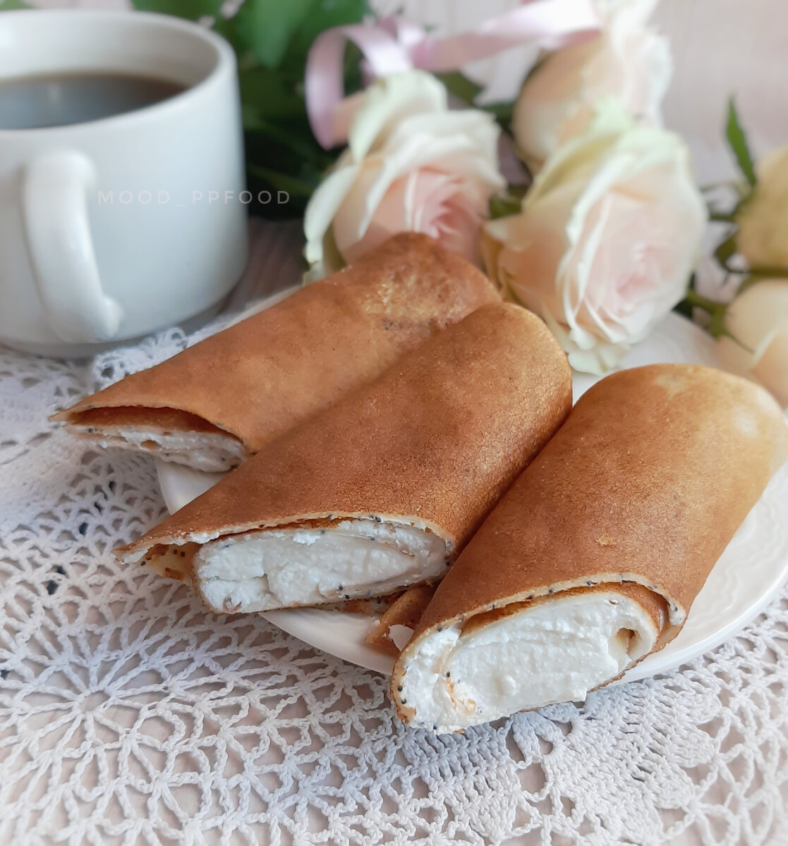 🥞КБЖУ на 100 г.: 182 ккал 11.8/8.8/13.6 Выход: 470 г., 4 блинчика. 🥞Ингредиенты: Яйцо куриное - 2 шт. Мука рисовая - 60 г. Масло оливковое - 5 г. Мак - 5 г. Молоко 2.5% - 150 г. Вода - 25 г. Щепотка соли, подсластитель. ▫️Для начинки: Творог 5% - 180 г. Сметана 15% - 50 г. Лимонный сок - 15 г. Щепотка ванилина. Подсластитель по вкусу. 🥞Приготовление: 1️⃣ В миску разбиваем два яйца, добавляем щепотку соли, подсластитель и 60 г. рисовой муки. Перемешиваем до однородной массы без комочков. 2️⃣ Добавляем по 5 г. масла и мака. Снова перемешиваем. 3️⃣ Добавляем 150 г. молока и 25 г. тёплой воды. Снова перемешиваем, тесто получается жиденькое. 4️⃣ Разогреваем сковороду, выливаем половничек теста и распределяем по сковороде. Жарим как обычные блинчики с двух сторон. У меня получилось 4 штуки. 5️⃣ Для начинки в миску складываем: 180 г. творога, 50 г. сметаны, 15 г. лимонного сока, щепотку ванилина и подсластитель по вкусу. Пробиваем погружным блендером до однородной консистенции. 6️⃣ На по