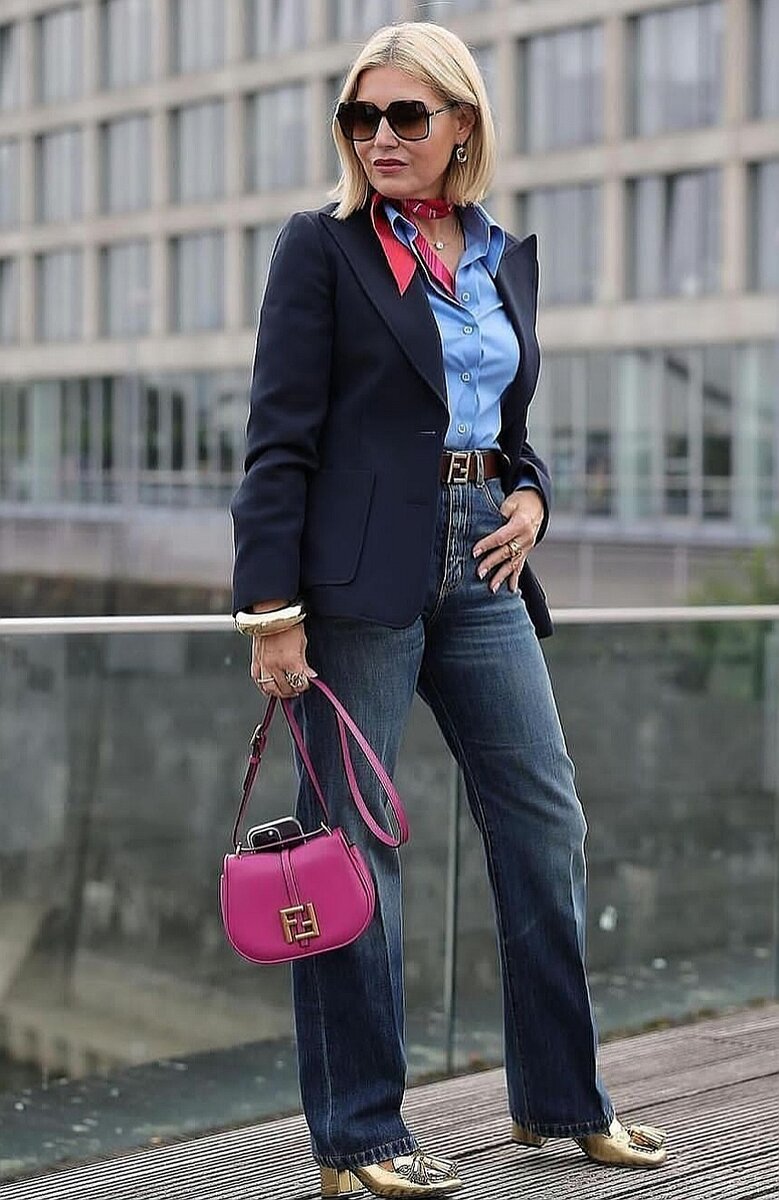 ❗Цвет. Если мы говорим не о деловом образе, ограниченном требованиями дресс-кода, то имеет смысл добавить в образ пиджак, который станет цветовым акцентом.