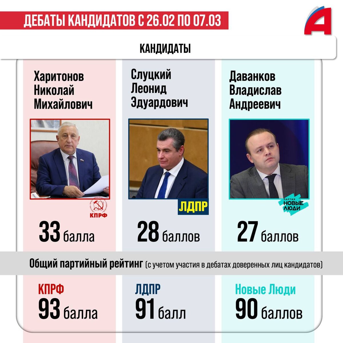 В итоге победителем его рейтинга стал кандидат от КПРФ Николай Харитонов. Вторым стал Леонид Слуцкий, а третьим Владислав Даванков.