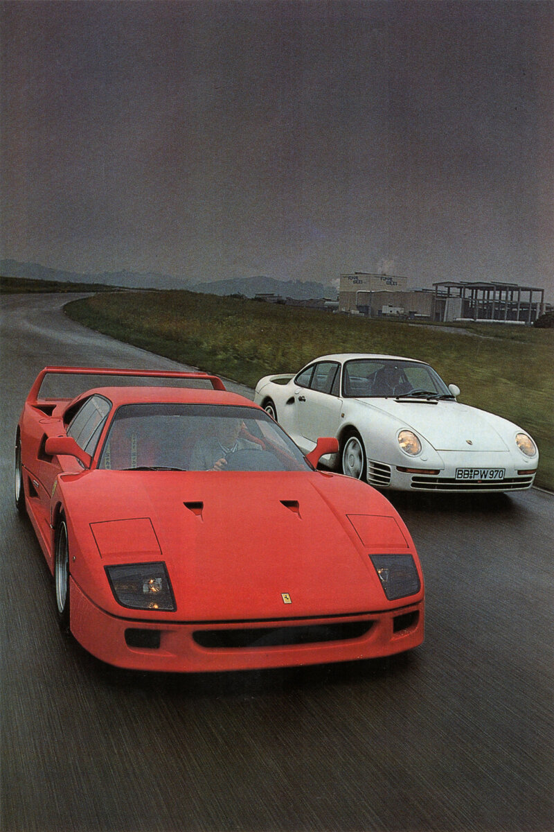 Дуэль двух икон 1980-х – максимально «аналоговый» и бескомпромиссный Ferrari F40 против технологически прорывного Porsche 959, задавшего дальнейший вектор развития суперкаростроения. Самый быстрый против самого совершенного.