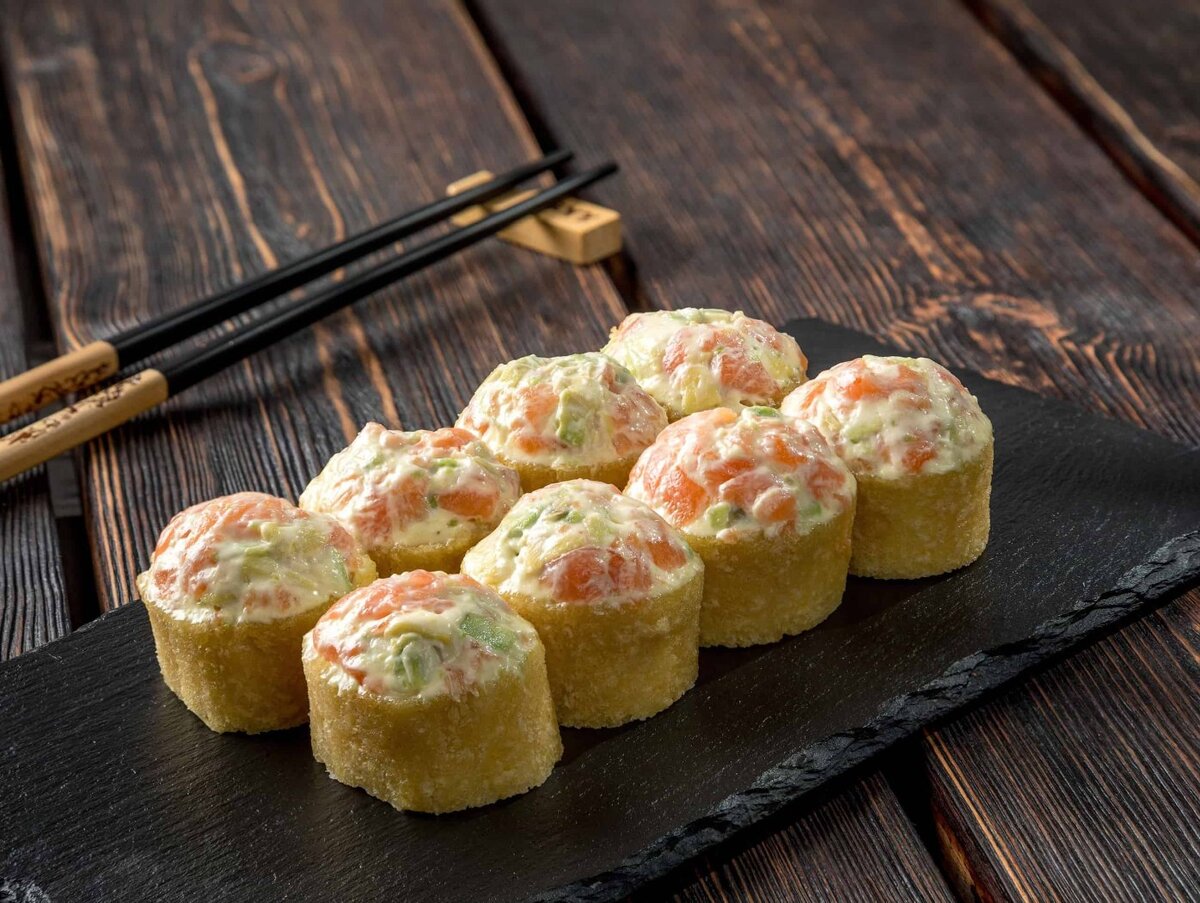 Маки: Это суши, завернутые в лист нори (сушеные водоросли). Они могут быть с начинкой внутри (хосомаки) или с начинкой внутри и снаружи (футомаки). Маки обычно нарезают на небольшие кусочки и подают с соевым соусом.