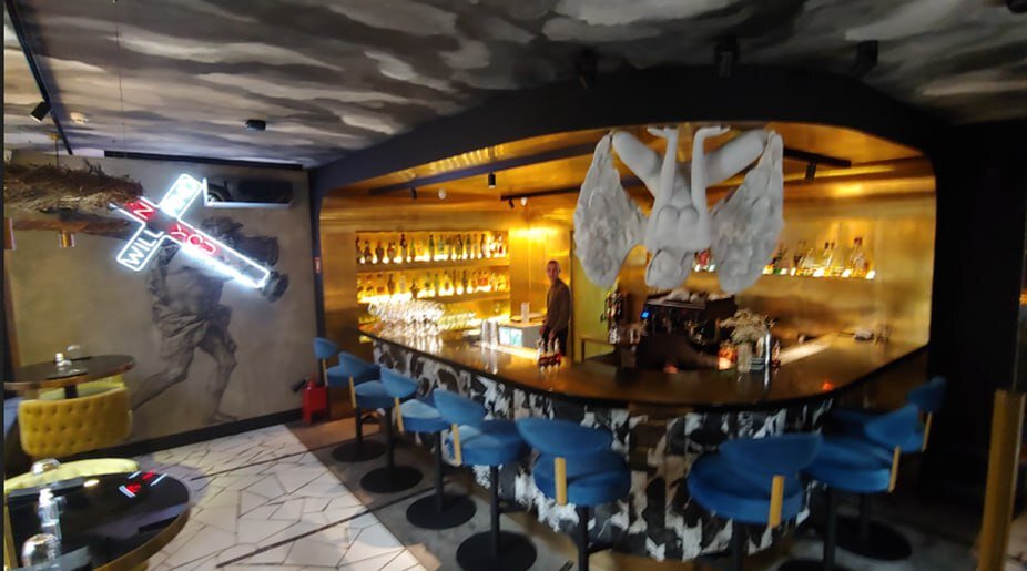 В барном зале мужчина, похожий на Христа, несёт Крест со словами "Грех найдёт тебя", над столиками висят светильники в виде терновых венцов, меню подаётся с печатью со словом "Бог" и Крестом.
