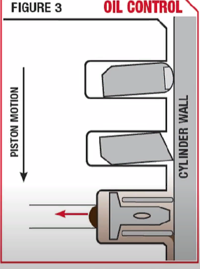 Мы знаем, что у нас есть 3 кольца (обычно), может быть и два. Одно сделано для того, что бы убирать излишки масла. Когда маслосъемное кольцо не будет снимать излишки масла, это приведет к тому, что у нас будет гореть масло и приведет все к загрязнению камеры сгорания, со временем будут образовываться наросты, которые могут привести к предварительному зажиганию (этому тему я уже объяснял в свечах зажигания).