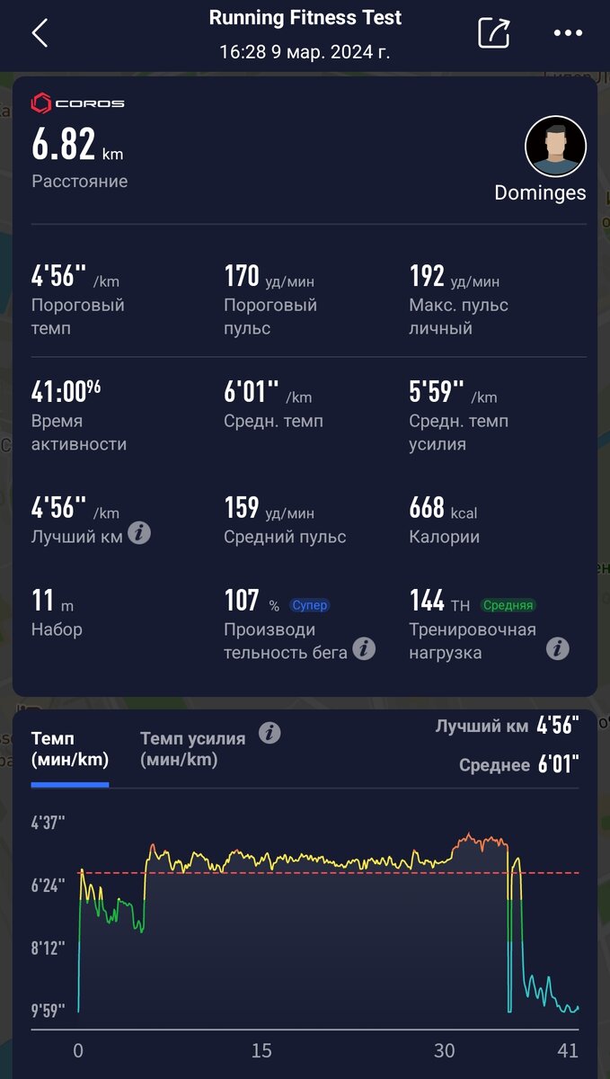 Спустя 3 дня восстановления на 4й вышел Я на беговой тест от Coros. Часы этой конторы мне подогнала жёнушка 3 месяца назад с напутствием на улучшение физической формы и АКТИВНОЕ снижение веса. И если с первым ещё куда ни шло, то второе судя по всему дастся с особым трудом. Но ничего, я настрое, мотивирован (вроде как), бросать не собираюсь. Так вот о самом ТЕСТЕ: - задаёшь своё время на 10км (я указал 52мин) - часы рассчитывают интервалы и показывают как будет идти тест - 5 минут разминка (бегом трусцой, легко). Пульс прогрелся до 140. - ТЕСТ 1: 25 минут 5:50-5:20/км, чуть медленнее моей скорости на 10км, пульс ушел в диапазон 156-164. Потею хорошо так - ТЕСТ 2: 3 минуты 5:20-4:50/км, так я последний раз нёсся всю десятку, моё ПАНО судя по всему, пульс ушел 170-175 - ТЕСТ 3: 3 минуты 4:50-4:20/км. По сути для меня это уже переХай, минуты полторы пытался разогнаться, но сил не хватило, даже чтобы войти в этот диапазон. 4:56, и быстрее не смог. Выплюнул лёгкие, перешёл а шаг (!!!), пу