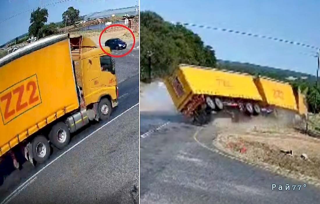 Шокирующие кадры с камеры видеонаблюдения, установленной на автомагистрали в африканской провинции Гаутенг, были опубликованы на местных новостных ресурсах. Водитель легкового автомобиля грубо нарушил правила дорожного движения и не уступил дорогу несущемуся грузовику. Легковушка буквально протаранила большегруз, который опрокинулся в кювет. Работник транспортной компании, управлявший фурой, не пережил столкновения. Источник