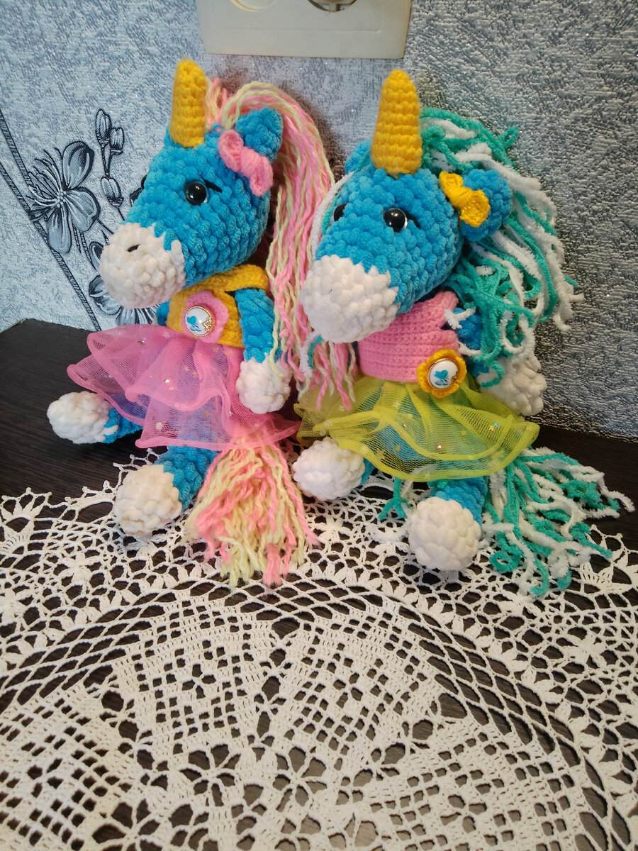Сестрёнки единорожки. На День рождения внучке. Эти лошадки связаны были 4 года назад, но до сих пор они пользуются спросом, уже у младшей. Сегодня попались на глаза решила вам показать. 🥰