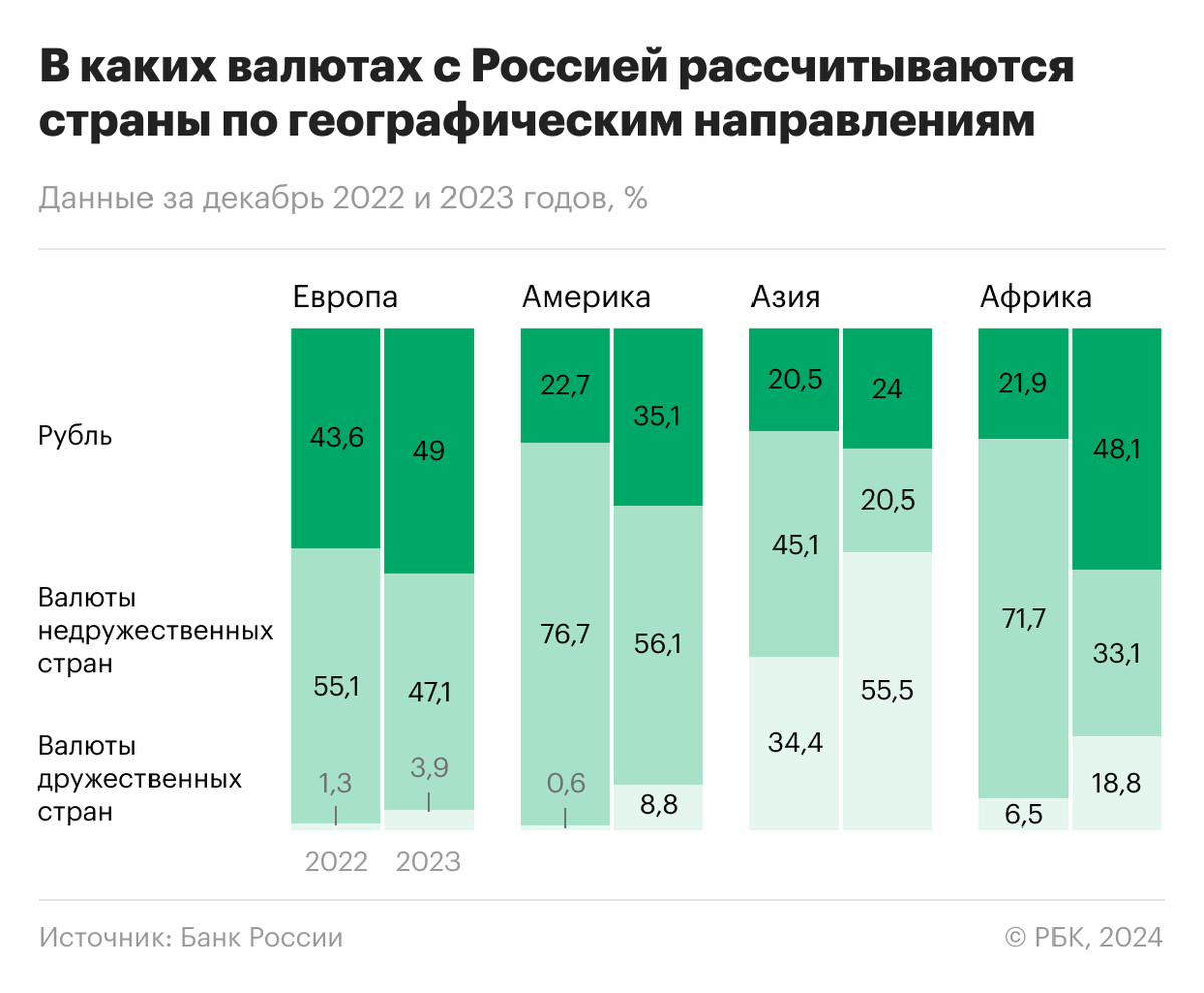 Доля рубля в расчетах со странами Европы, Америки, Африки и Азии выросла за последние два года. Причем сильнее всего выросла доля расчетов в рублях у Африки, следует из данных Банка России. Если в 2022 году объем рублевых расчетов с африканскими странами составлял 21,9%, то в 2023 году — уже 48,1%. Сильно также вырос объем рублевых расчетов со странами Америки — с 22,7 до 35,1%. Доля рубля в расчетах со странами Азии выросла не сильно — с 20,5 до 24%. В то же время там сильно упала доля оплат в валютах недружественных стран (евро, доллар США и другие) — с 45,1 до 20,5%. Читайте также: Франция создаст альянс с готовыми к отправке войск на Украину странами