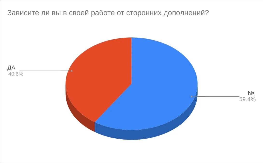 Сначала мы изучили процент людей, которые полагаются на дополнения сторонних производителей для выполнения своей работы. Соотношение составляет почти 40/60: 40,6% абсолютно нуждаются в дополнениях, в то время как 59,4% прекрасно обходятся без них.