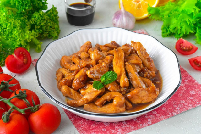 ИНГРЕДИЕНТЫ Куриное филе - 600 гр Соевый соус - 60 мл Чеснок - 4 зубч. Растительное масло - 2 гр. Перец черный молотый - по вкусу. Соль Как сделать курицу в соевом соусе с чесноком на сковороде? Очень просто. Для начала подготовьте необходимые ингредиенты по списку. Филе курицы можете использовать с грудки или бедра птицы. Помимо указанных специй можете использовать свои по вкусу, например, паприку, хмели-сунели и т.д. Вместо обычного соевого соуса можете добавить полусладкий соус терияки. Тогда мясо получится с легким сладким привкусом. ШАГ 2: Куриное филе вымойте, обсушите и нарежьте брусочками. ШАГ 3: Зубчики чеснока мелко порубите. Свежий чеснок можете заменить на 1 ч. л. сухого чесночного порошка. ШАГ 4: В миску выложите куриное филе, измельченный чеснок. Добавьте соль и перец и перемешайте. Оставьте мясо на 15-20 минут. При добавлении соевого соуса в блюдо стоит учесть, что он имеет достаточно соленый вкус. Уменьшите общее количество соли, иначе рискуете пересолить. ШАГ 5: В ско