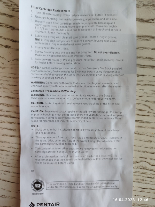 И вот случился казус, ранее аналогов не имевший. Один покупатель, приобретший в нашем торговом отделе пентэйровский GAC-10, прочел инструкцию по его применению, после чего устанавливать этот картридж в свою домашнюю проточную систему ему расхотелось… Почему? В инструкции черным по белому на русском языке было написано: «Калифорнийское предложение 65. Предупреждение: ВНИМАНИЕ Этот продукт содержит химические вещества, известные штату Калифорния. Калифорния, чтобы вызвать рак, врожденные дефекты или другой репродуктивный вред». Явно подстрочный перевод, причем не самый умелый. Логично предположив, что штат Калифорния населен тем же биологическим видом Хомо Сапиенс, что и наш покупатель-сибиряк, он, вняв подобному предупреждению, решил вернуть столь опасную штуковину.