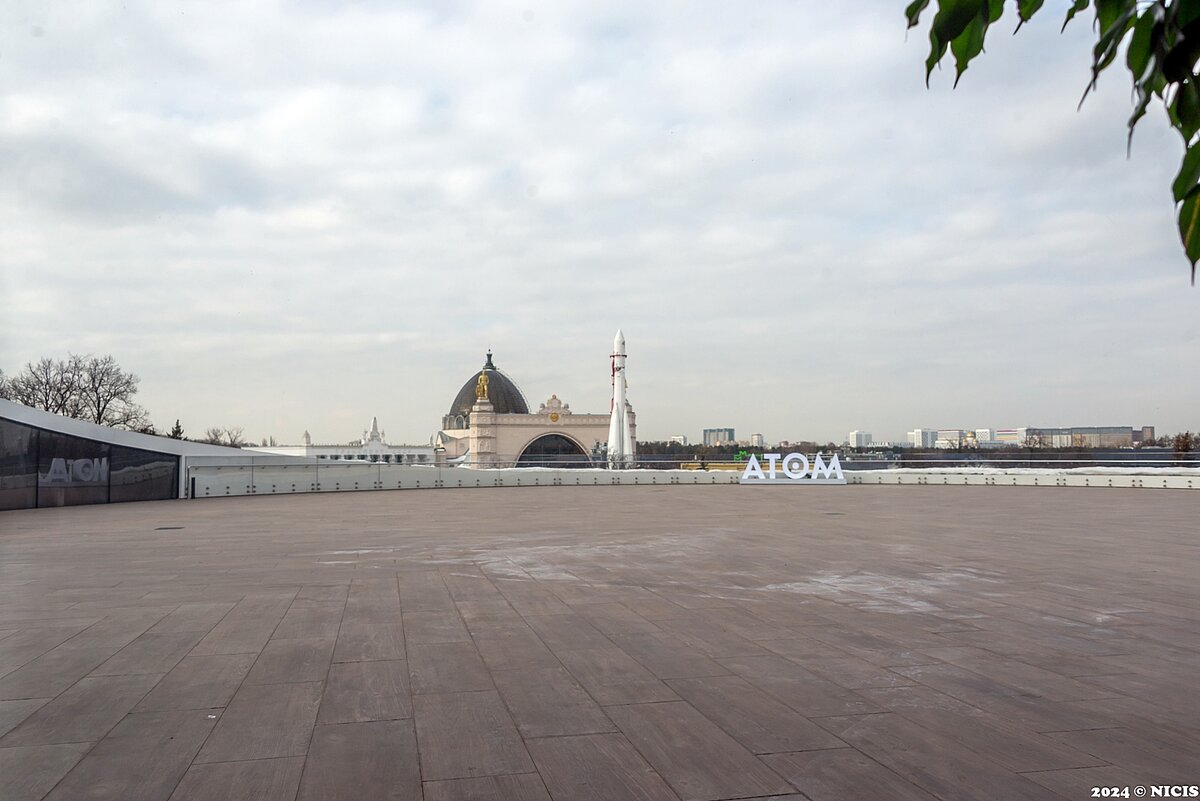 Доброго всем дня. На выставке достижений есть много мест, откуда можно посмотреть на ее территорию сверху, одно колесо обозрения "Солнце Москвы" чего стоит. Но вот, с началом форума "Россия" появилось еще одно и точно останется после проведения этого масштабного мероприятия. Речь идет о павильоне "Атом", точнее даже о его верхней части, которую можно было бы назвать крышей, но это не совсем так. На самом верхнем этаже павильона расположилось кафе (или ресторан даже) с оформлением в научном стиле и даже с соответствующей подачей десертов со всяческими эффектами. Но не этот момент тут даже важен, хотя и интересен. Здесь, пока еще за стеклом, видимо по причине зимнего периода, есть огромное пространство, которое, можно предположить, стане обзорной площадкой и местом для летней части кафе. А пока, пока из-за стекла открываются вот такие виды. И ремарка по ценам: не самые демократичные, но и безумно высокими их не назовешь - ВДНХ никогда не славился бюджетными местами для обеда или перекуса