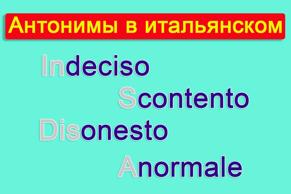 Когда мы учим новые прилагательные на иностранном языке, лучше всего всегда запоминать их в паре с антонимами. Сегодня поговорим об антонимах в итальянском. Антонимы могут быть выражены разными словами, которые не имеют общего корня - в этом случае мы прилагаем больше усилий, чтобы их запомнить на иностранном языке. В итальянском это, например: Buono - cattivo (хороший - плохой), caldo - freddo (горячий - холодный), acceso - spento (включенный - выключенный), ricco - povero (богатый - бедный), bello - brutto (красивый - некрасивый). У этих слов нет общего корня. А есть антонимы с единым корнем, которые в русском языке образуются при помощи приставки НЕ. В итальянском за противоположное значение отвечает несколько приставок: IN (и ее благозвучные варианты), DIS, S и A. В первую очередь так образуются антонимы прилагательных. Антонимы, которые образуются добавлением приставки IN (im, il, ir) Прилагательные (Agettivi contrari): Deciso - Indeciso / Решительный - нерешительный Capace - In