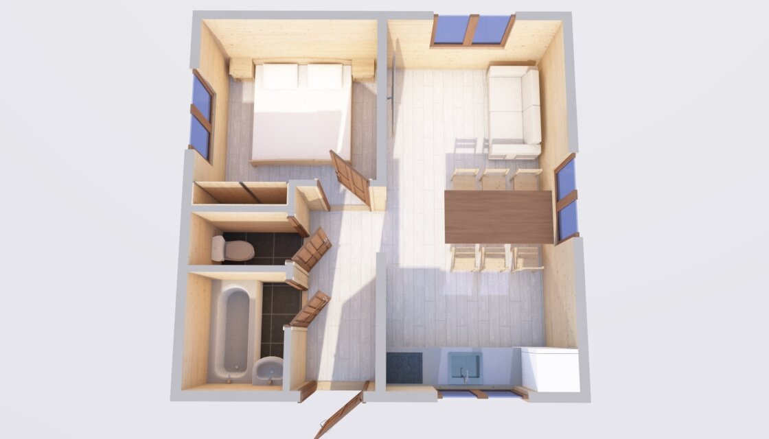 Всем привет! Тема сегодняшней статьи посвящена обзору достаточно удачной планировки дома 6х6 м, оставленной в комментариях. Почему же я так много внимания уделяю таким крохотным планировкам? Все просто: в нескольких статьях мы раз и навсегда научимся ПРАВИЛЬНО планировать ПОЛЕЗНЫЕ ПЛОЩАДИ (аля выжимать максимум из минимальных возможностей), потом таких статей большей не будет (будем рассматривать гораздо большие объемы домов по вместимости и комфортабельности). Чем же мне понравилась данная планировка? 1) Расположение окон НА ВСЕХ СТОРОНАХ СВЕТА (можно также откорректировать окна как угодно в кухне гостиной: добавить или увеличить). 2) Важный момент, на который я обратил внимание: данная планировка может быть актуальна также ДЛЯ КВАРТИРЫ (угловая). Если мы перенесем с западной части спальни окно на север и уберем окно на кухне с юга, то получается расположение окон по 2 сторонам света. Разберем планировочное решение: 1) Прихожая объединяет в себе абсолютно все помещения: ванная, санузе