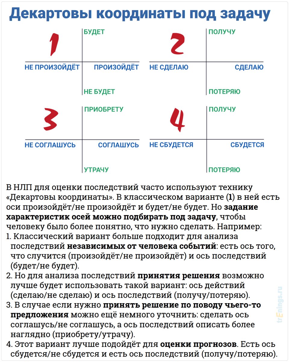 В НЛП для оценки последствий часто используют технику «Декартовы координаты». В классическом варианте (1) в ней есть оси произойдёт/не произойдёт и будет/не будет. Но задание характеристик осей можно подбирать под задачу, чтобы человеку было более понятно, что нужно сделать. Например: