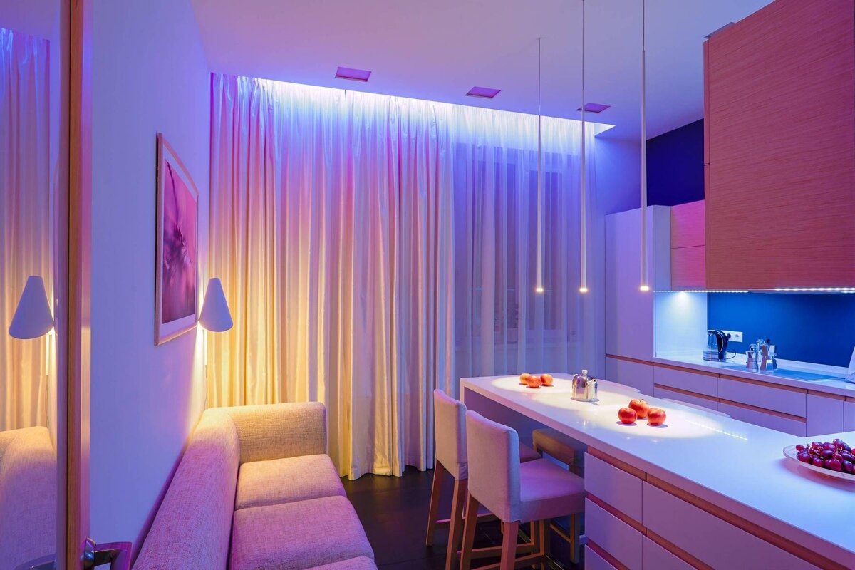 Что нужно для нормальной работы светодиодной подсветки? Конечно, сама лента, блок питания, и контроллер (для изделий с эффектами). Блок питания нужен для бесперебойной работы любых лент. А вот монтаж светодиодных лент RGB, RGBW, White-D-MIX и White-TRIX невозможен без контроллера. Этот элемент необходим для управления световыми режимами подсветки. Теперь, когда вы вкратце поняли разницу между лентами, предлагаем поговорить об организации светодиодного освещения в самых разных зонах, а мы предложим вам несколько самых оптимальных вариантов ее размещения.