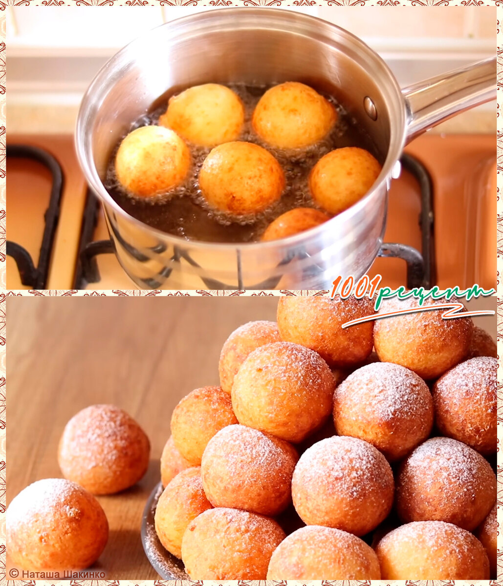 🔸Сахарная пудра для украшения В миску кладем творог. Добавляем яйца, сахар и соль. Все перемешиваем вилкой до однородной консистенции. Всыпаем половину муки, добавляем соду и перемешиваем. Всыпаем оставшуюся муку и замешиваем мягкое, слегка липкое тесто. Руки и тесто подпыляем мукой, отрываем небольшие кусочки и скатываем шарики размером чуть меньше грецкого ореха. Творожные шарики прикрываем пленкой, чтобы не заветривались. В небольшой ковш или сотейник наливаем достаточное количество растительного масла и хорошо его разогреваем. Делаем огонь чуть ниже среднего. Опускаем в разогретое масло несколько пончиков. Чтобы понч