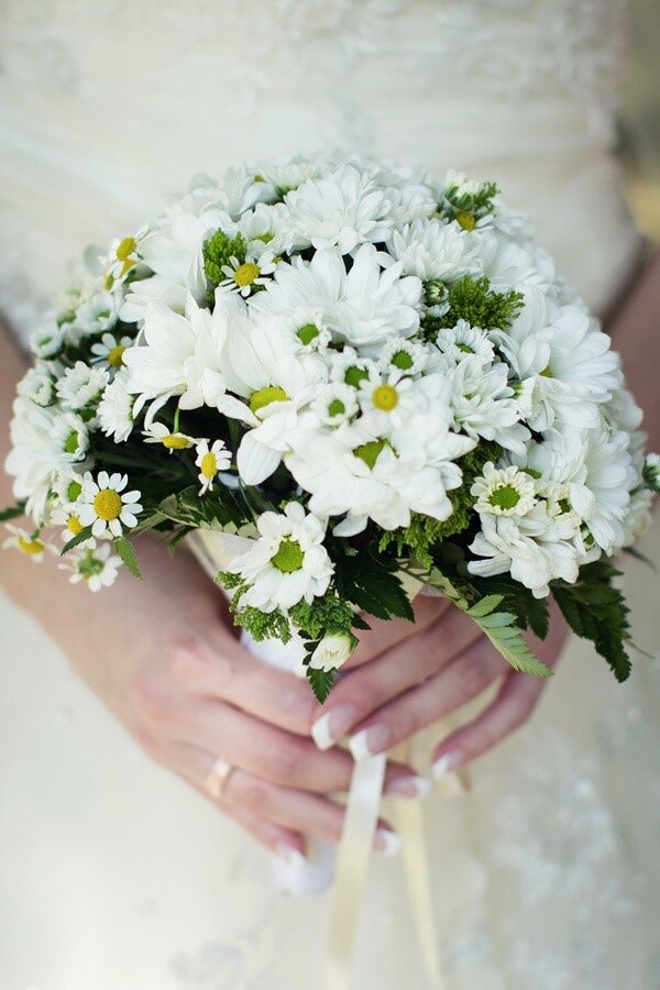 Вне зависимости от того, в каком стиле оформлена свадьба, ее неотъемлемыми атрибутами в любом случае будут подвенечное платье, обручальные кольца и свадебный букет. Последний атрибут требует особого внимания, поскольку именно от правильности его подбора будет зависеть гармоничность образа невесты, а значит, и общее впечатление от торжества. От свадебного букета зависит гармоничность образа невесты Популярными среди современных девушек являются букеты невесты из ромашек. Их востребованность вовсе неудивительна – они подходят и для классической церемонии, и для торжества в стиле кантри или рустик. Отлично сочетаются композиции из этих цветов и с платьями простого пошива, и со стильными дорогими моделями. Ромашки – это олицетворение чистоты и невинности, благодаря чему в любом оформлении они всегда уместны на свадебном торжестве. Букеты из ромашек пользуются популярностью у невест Оформление свадебного букета Доверить оформление букета невесты из ромашек целесообразно опытному флористу.