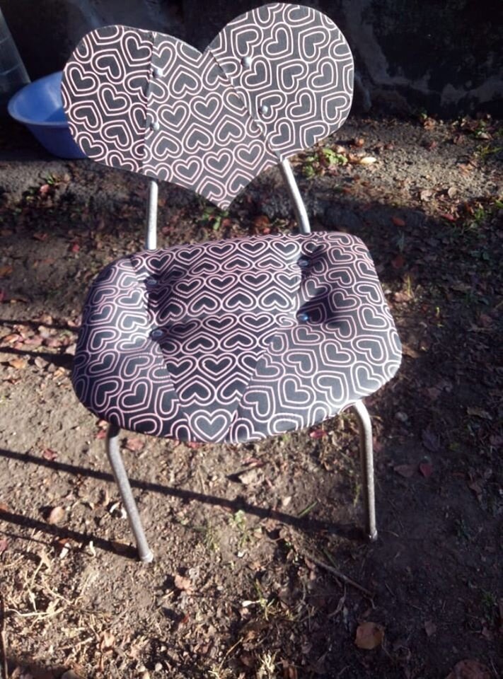 Этот стул, и его близнец, появились на свет благодаря коронобесию. Конец марта 20-го. Поехал в Нальчик к подруге в гости. Подруга - почти два метра женственности и красоты. И я, шпендик, 165 с кепкой. Классный такой контраст. В это время объявляют карантин. Звоню в Ставрополь. Мне рассказывают: офис закрыт и опечатан, улицы пустые, народ забился по норам. По пустым улицам, как в фантастических фильмах, полицейские машины с мигалками и сиренами летают. И только "братьям" с солнечной Армении вирус нипочём. Они как отделывали, так и продолжают отделывать фасад моего дома в Ставрополе, по программе капитального ремонта. Как укладывали, так и укладывают тротуарную плитку. Никто их не трогает. Ну и завис я в Нальчике на две недели. Делать нечего, а бездельничать не могу, если пил бы, можно спиться. В сарае нашел две основы от старых стульев, которые раньше в столовых и буфетах были, поломанный зонтик с тканью в сердечках, кусок поролона из негодного кресла. И вот что у меня получилось. Кро