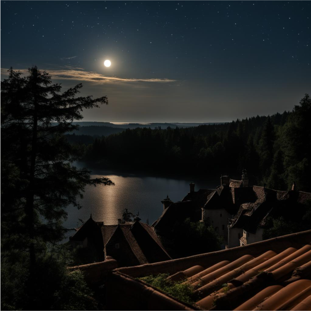 Мы стояли на ровной площадке, опоясывающей покатые остроконечные крыши. Луна смотрела прямо на наш выход. Я оставил Алину и подошел к перилам. Внизу виднелся двор, а за ним замковый городок. Сейчас там было тихо и темно. Куда же они все подевались? За стенами замка лежало огромное озеро, лунная дорожка на нем была ровной и безупречной. Слева, откуда с неистовством задувал ветер, стоял темный бесконечный лес. Я осмотрел все, но ничего похожего на ключ не попадало в поле моего зрения, но, когда я обернулся к Алине, чтобы сказать об этом, над ее головой на самой вершине крыши что-то блеснуло.