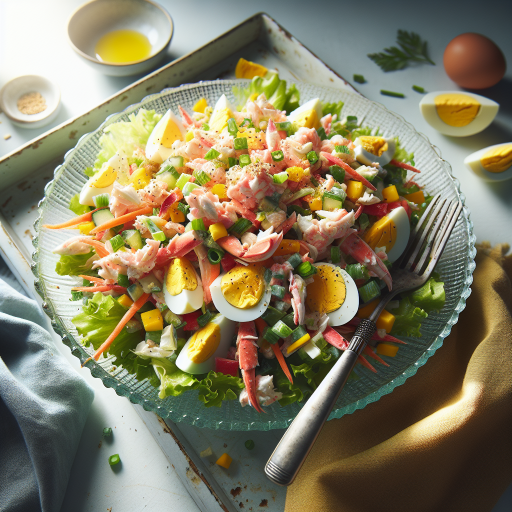 Привет! Сегодня я поделюсь с вами моим уникальным рецептом крабового салата. Ингредиенты: · Крабовое мясо (консервированное или свежее) · Огурцы · Помидоры · Яйца · Майонез · Зелень (укроп, петрушка) · Лимонный сок · Соль, перец по вкусу Пошаговый Рецепт салата крабовый: Шаг 1: Варю яйца до готовности и мелко нарезаю их.