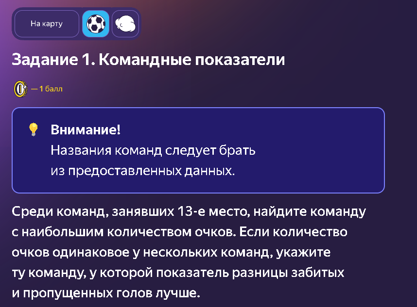 Среди команд, занявших 13-е место, найдите команду с наибольшим количеством очков. Если количество очков одинаковое у нескольких команд, укажите ту команду, у которой показатель разницы забитых и пропущенных голов лучше. Ответы на весь тур у меня в телеграмме: https://t.me/otveti_yandex