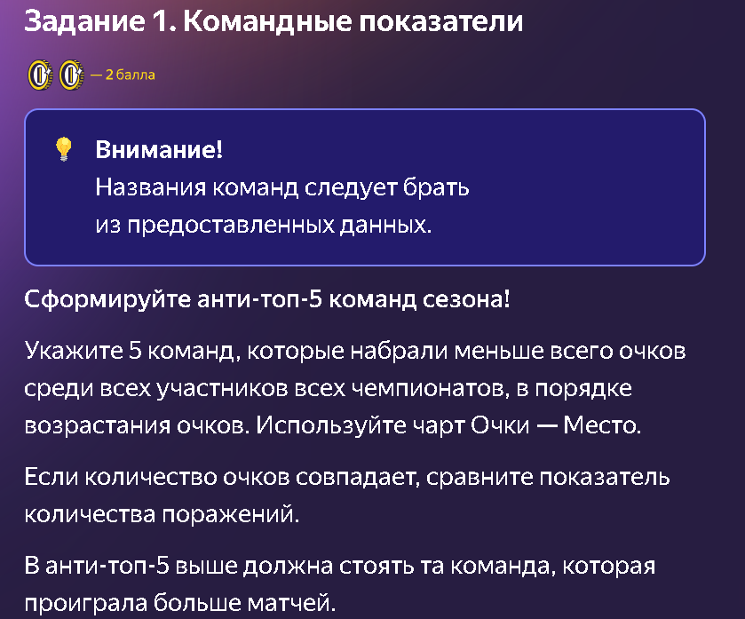 Сформируйте анти-топ-5 команд сезона! Укажите 5 команд, которые набрали меньше всего очков среди всех участников всех чемпионатов, в порядке возрастания очков. Используйте чарт Очки — Место. Если количество очков совпадает, сравните показатель количества поражений. В анти-топ-5 выше должна стоять та команда, которая проиграла больше матчей. Ответы на весь тур у меня в телеграмме: https://t.me/otveti_yandex