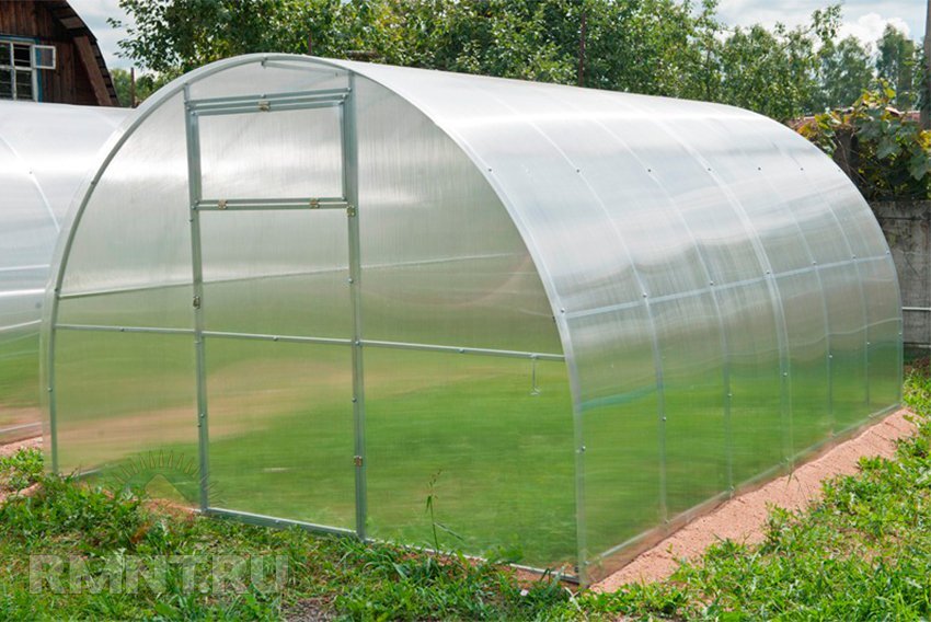 Крыша теплицы будет полукруглой, с невысокими боковыми стенами. Каркас собирается сваркой, а поликарбонат крепится саморезами к каркасу. Высота конструкции будет 1,8 м. Дуги теплицы располагаются так, чтобы листы поликарбоната стыковались на дугах. Для уплотнения стыков между листами используются Н-образные планки. Теплица стационарная, поэтому концы каркаса следует забетонировать. Используя малозаглубленный ленточный фундамент под всей конструкцией дополнительно изолируется почва внутри теплицы от окружающей среды.